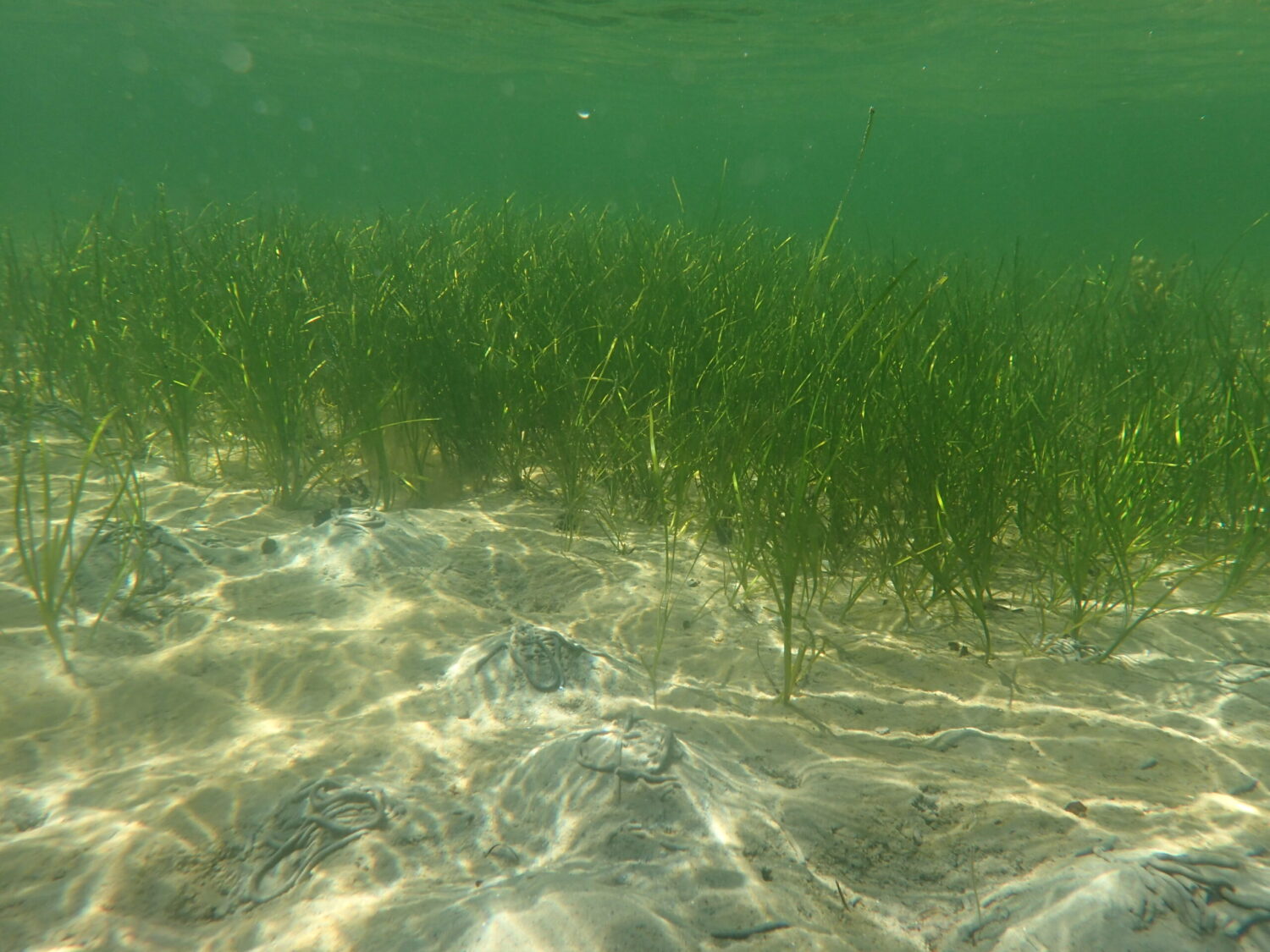 Genplantning af ålegræs fører til øget binding af kulstof i havbunden og samtidig øger det biodiversiteten ved at give skjul og føde til dyr i havet. Foto: Troels Lange.
