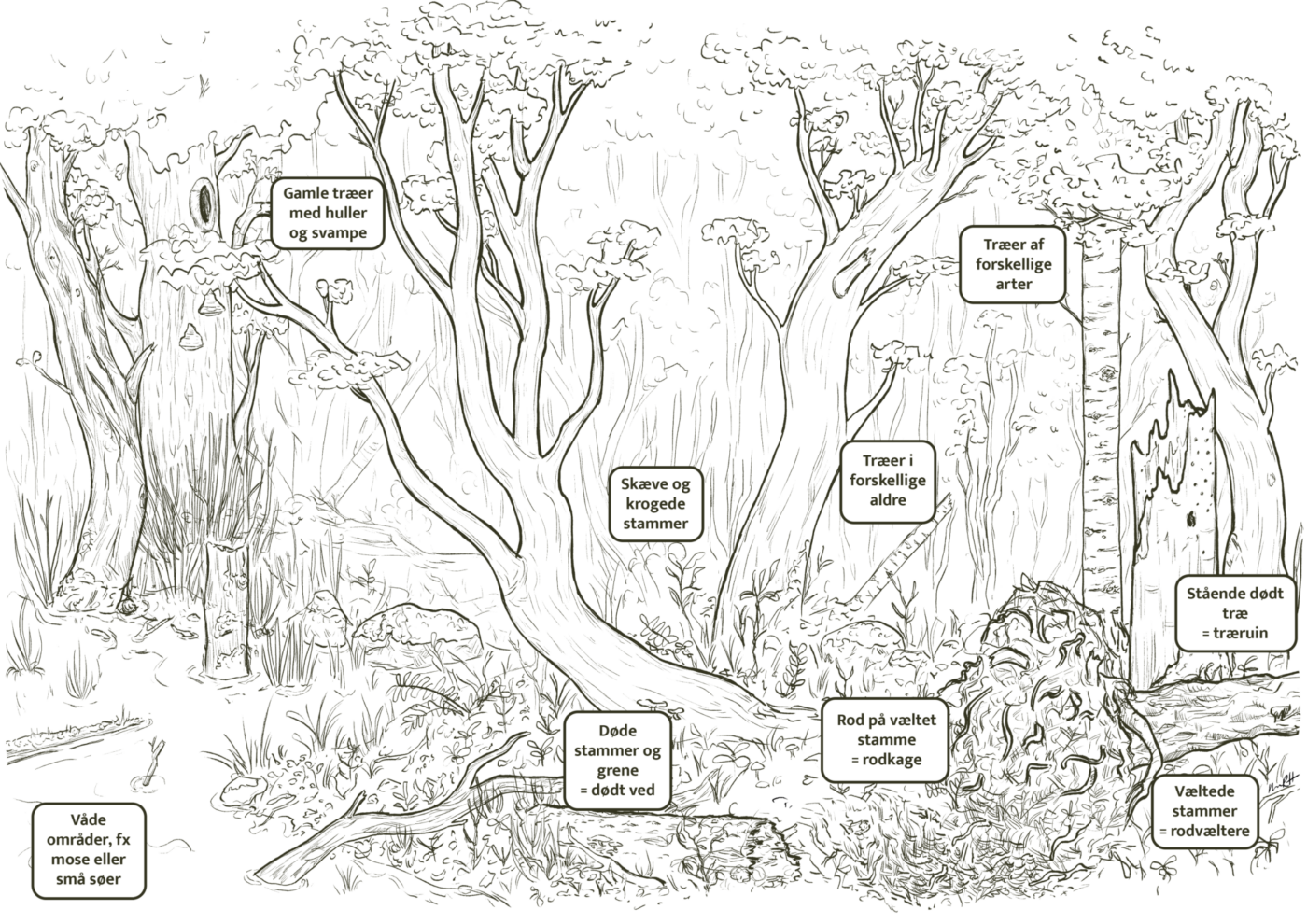 Tegnet model med typiske elementer, der kendetegner produktionsskov.
